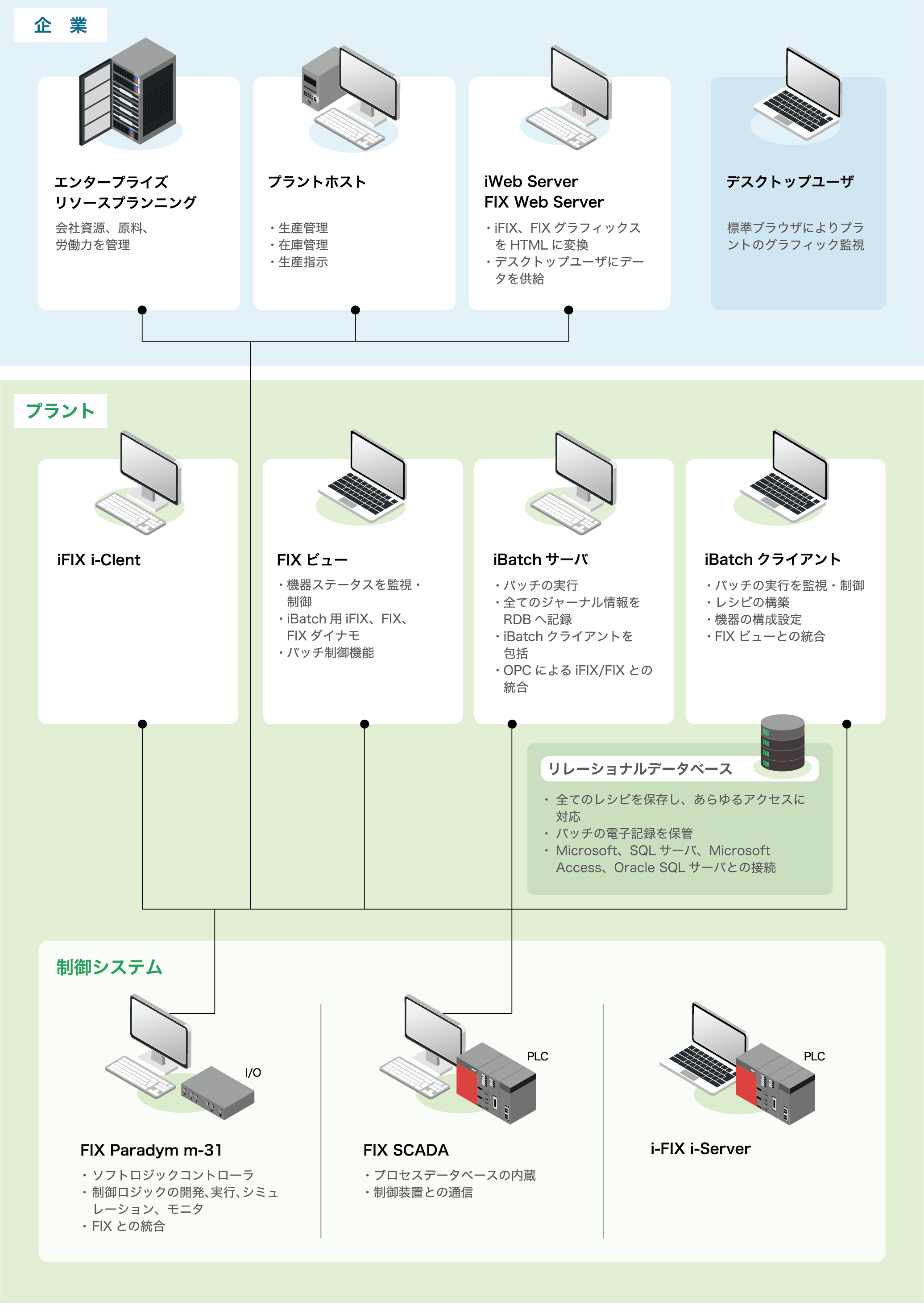 コンピュータ制御システムの特長今、企業はコスト削減や生産性向上のためプラントにおいて情報の共有化が進んでおります。さらに高品質な製品を安全生産するために製造現場の情報を高度に把握することが大変重要になっております。これらのことを解決するために日野システックは世界でトップの実績があるインテリューションのパッケージソフト(iFIX)についてシステムインテグレータの認証を得ています。このパッケージソフト(iFIX)を利用してのシステム開発は、日野システックの制御システムエンジニアにより製薬、食品、ガス、石油、電力等のプラントにおいて多くの実績があり、お客様の要求に十分お応えできます。
