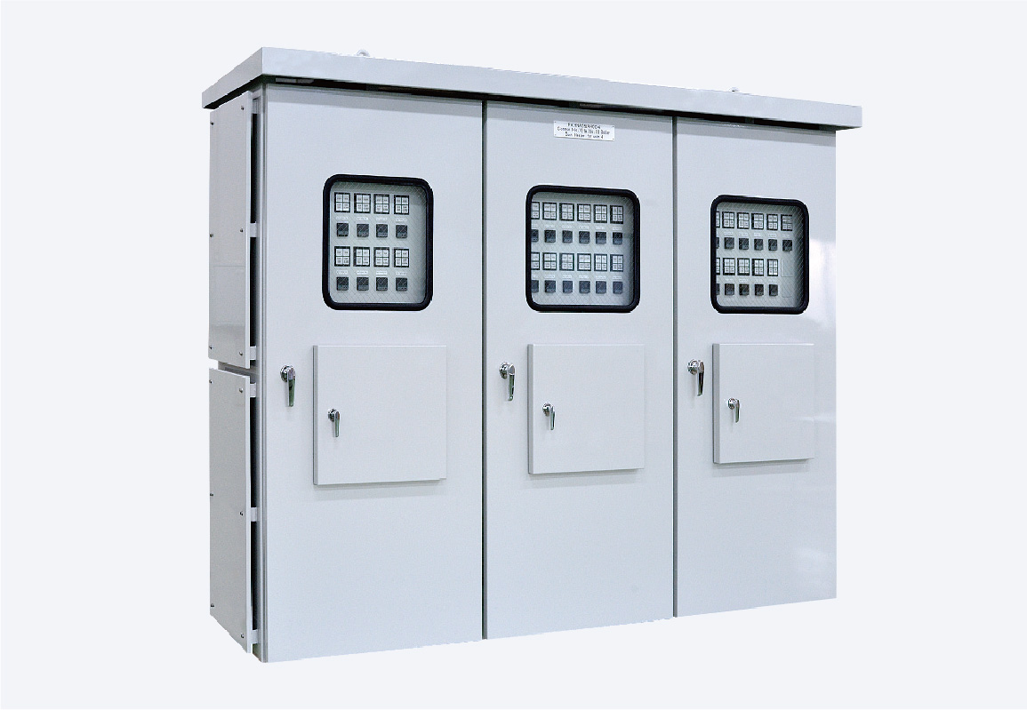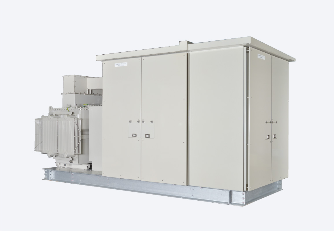 分散型メガソーラーで必要となる特別高圧の副変電所設備。実績のあるメーカーの遮断器(リングメイン)、配電盤、トランスを1つのユニットにした製品です。配線工事及び現地試験を簡略化でき、コストメリットに優れた製品です。